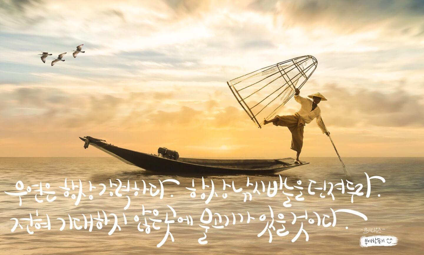 인생에서 기회를 많이 접했나요? [오비디우스]는 "우연은 항상 강력하다. 항상 낚시 바늘을 던져두라. 전혀 기대하지 않은 곳에 물고기가 있을 것이다."라고 말했습니다. 세상에는 예상하고 일어나는 일보다 예측하지 못한 일들이 더욱 많이 일어나곤 합니다. 그렇기 때문에 '우연'이라는 것은 강력한 힘을 갖고 있습니다. 기회는 누구에게나 찾아오지만 기회를 잡는 것은 누구나 하지 못합니다. 준비가 되어 있는 사람이 기회가 왔을 때 그 기회를 잡을 수가 있습니다. 전혀 기대하지 않았던 곳에서 큰일이 일어날지도 모르기에 다양한 부분에 대한 대비나 준비하는 마음가짐이 필요합니다. 모든 가능성을 열어두고 전혀 기대하지 않은 곳에서 많은 것을 얻는 기회를 놓치지 않는 삶을 살아가심이 어떨까요?